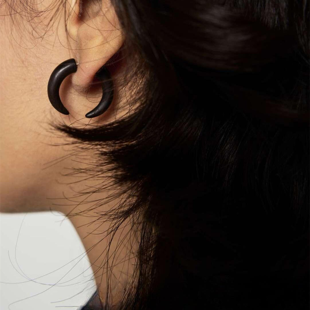 The Xuan Moon earrings express a calm, restrained aesthetic through simple curves and balanced proportions. The design avoids excess, allowing the natural wood texture and shape to speak for themselves with understated confidence.