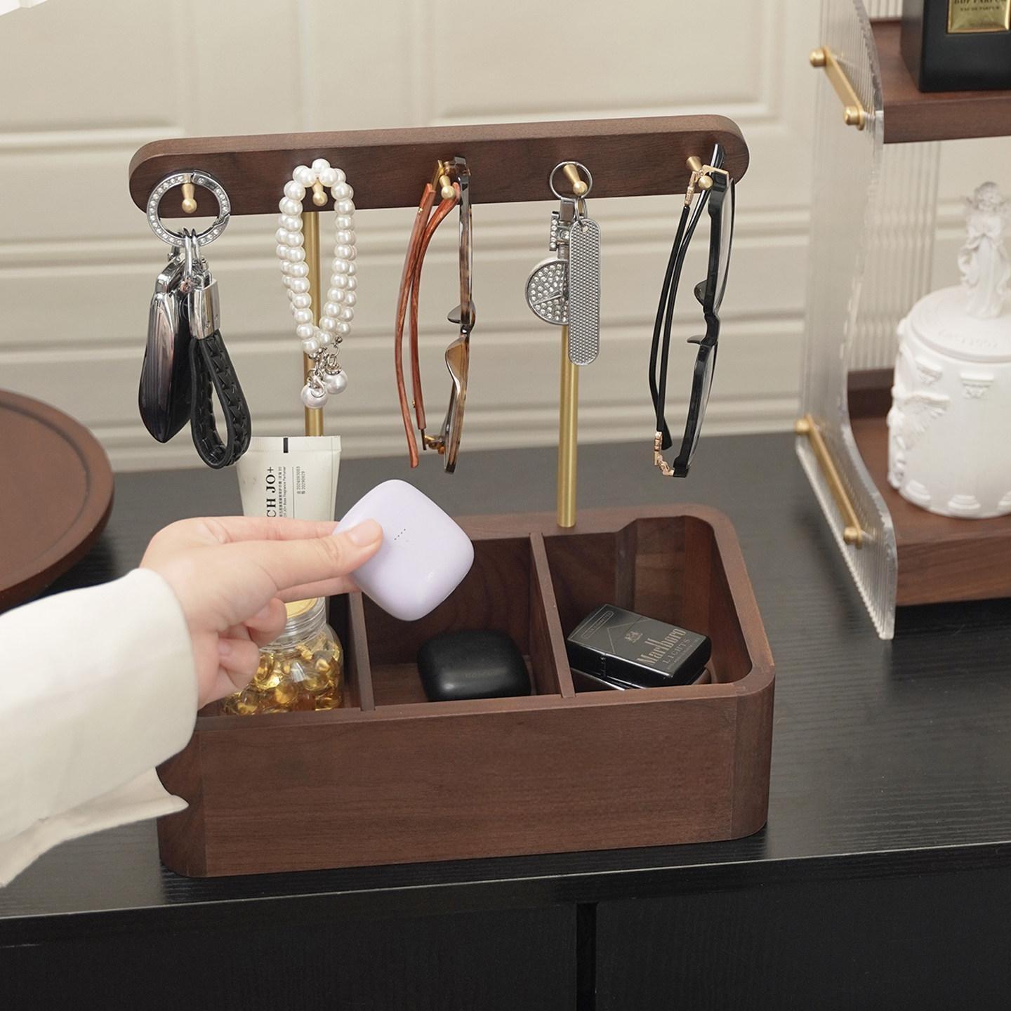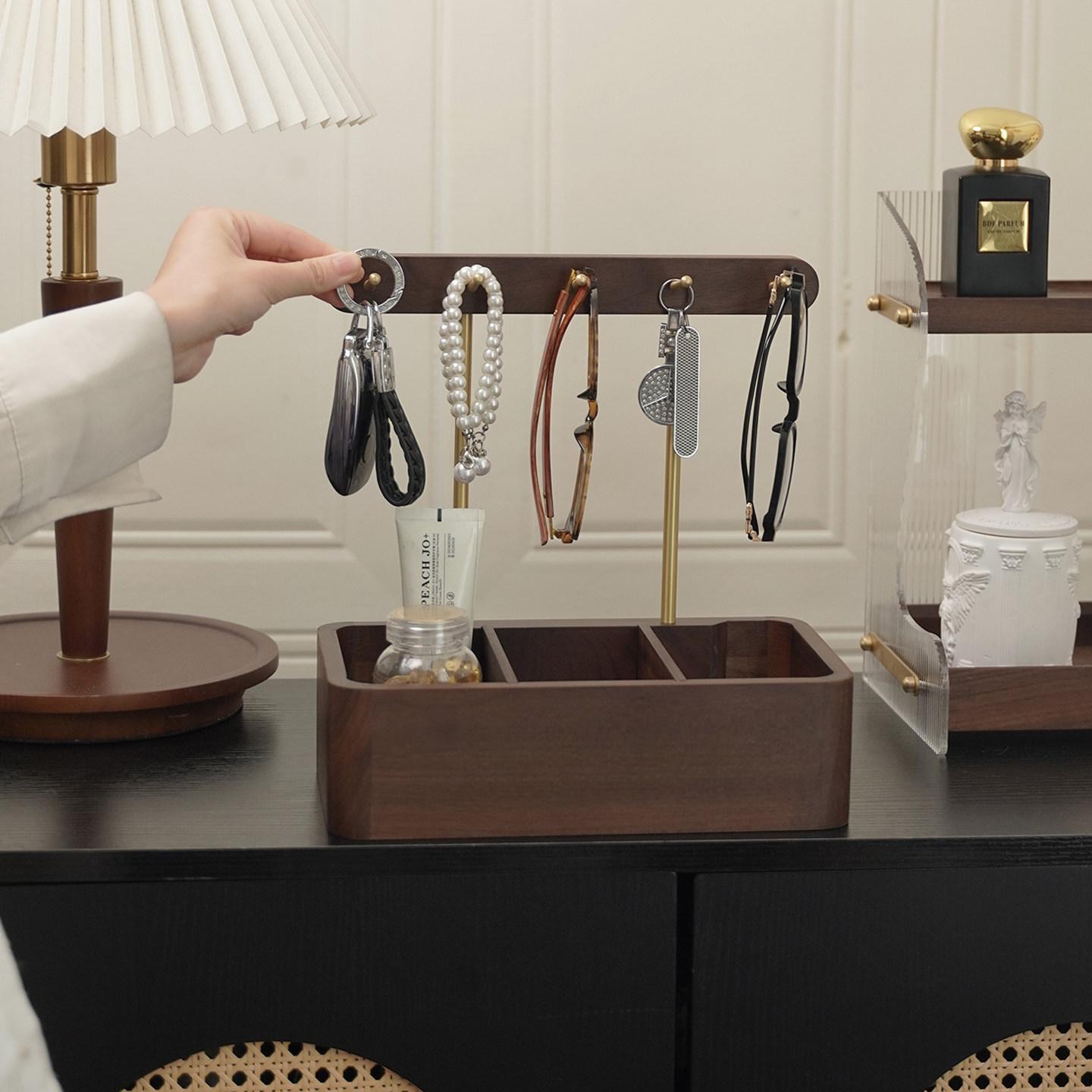 Designed as a simple solid wood stand tray desktop shelf with hook multi-functional storage tray, it offers layered open storage for keys, earphones, wallets, glasses, coins, and small everyday items. The hooks keep keychains and headphones visible and easy to grab, while the trays organize loose clutter.