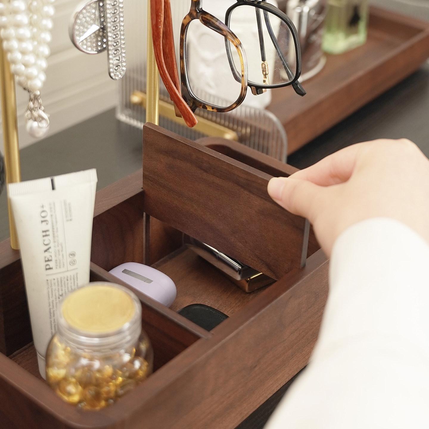 This desktop entryway organizer pairs solid black walnut wood with warm brass accents—a classic design duo that instantly elevates your space. One element feels calm and grounded, the other refined and elegant, together creating a high-end look that fits modern homes perfectly.